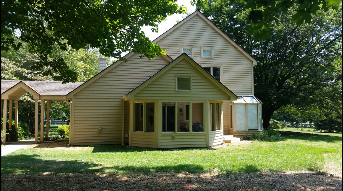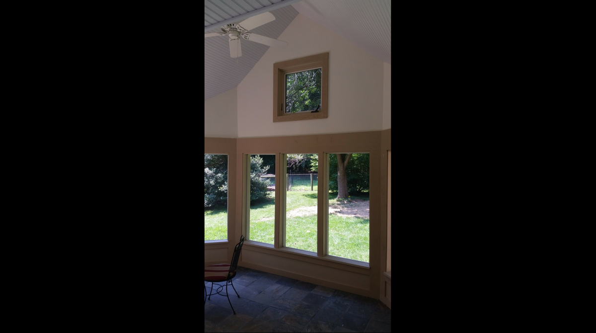 Screened porch with stone floor, cedar siding. Mudroom/laundry room addition.