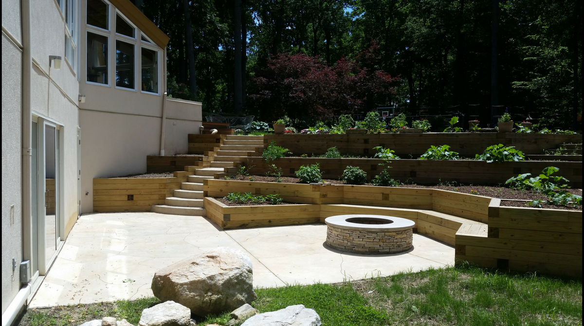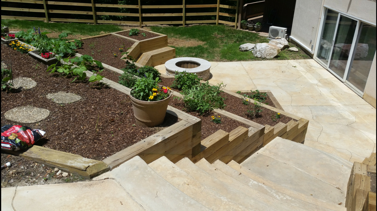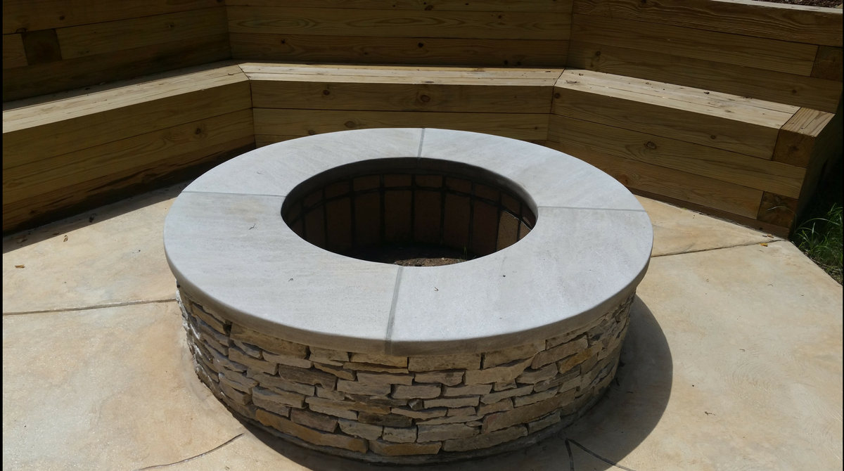 Fire pit with limestone cap, stone pattern concrete patio and planter seating. Steps are both concave and convex.
