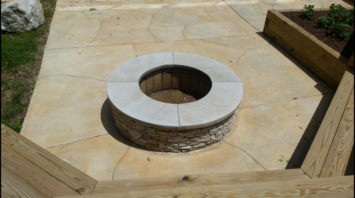 Fire pit with limestone cap, stone pattern concrete patio and planter seating. Steps are both concave and convex.